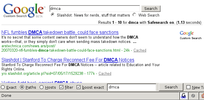 Search EverywhereWhichever web page you visit, use this tool to search over linked content. Just click the "G"-with-chain-link icon in your status bar to open or close the toolbar (or ctrl-alt-s). Great for searching from tables-of-contents, bookmarks, or blogs!